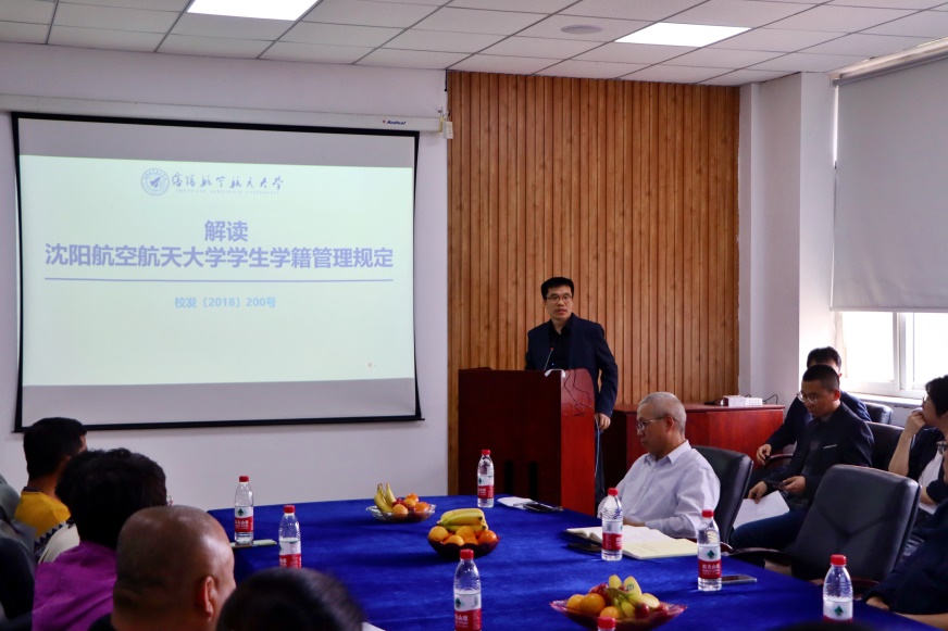 会上,张占伟向与会人员解读《沈阳航空航天大学学生学籍管理规定》,并结合真实案例,就学业预警规则、选课要求、学分要求等进行了详细介绍。