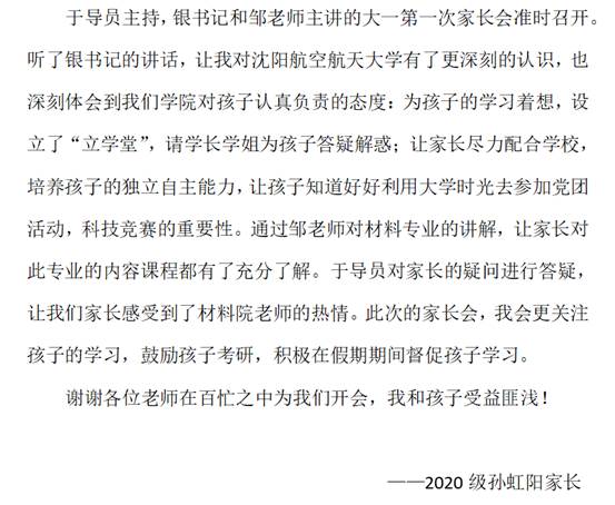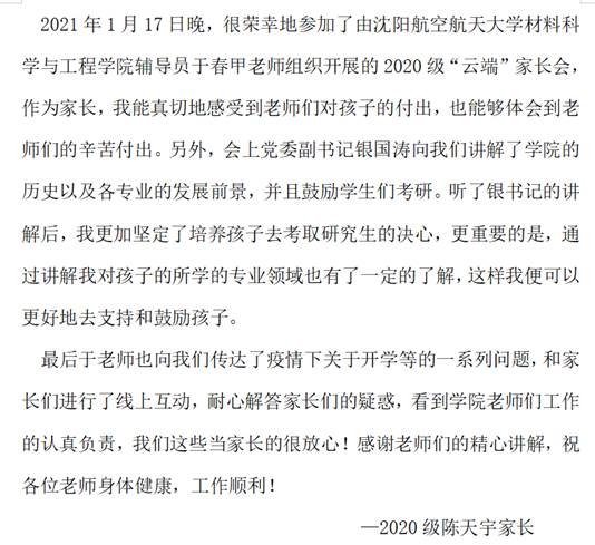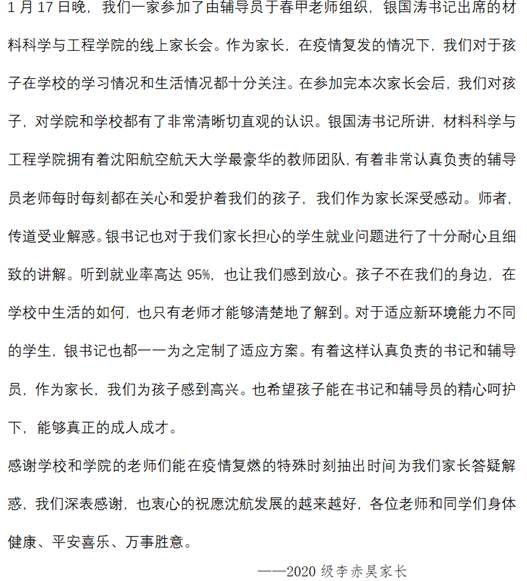 线上家长会,家校共谈心。为进一步落实立德树人根本任务,进一步加强和改进大学生思想政治教育,积极落实《沈阳航空航天大学2021年寒假“云端家访”活动实施方案》,深入了解学院学生及家长的诉求与期许,深化学院与大学生家长的合作沟通,提高大学生思想政治教育水平,yl7703永利各年级于一月中下旬陆续举行“线上家长会”。yl7703永利院长卢少微、yl7703永利党委书记路楠、yl7703永利副院长冯长杰、yl7703永利党委副书记银国涛、教师代表农智升、邹乃夫、柏冬梅及各年级辅导员老师积极参会。