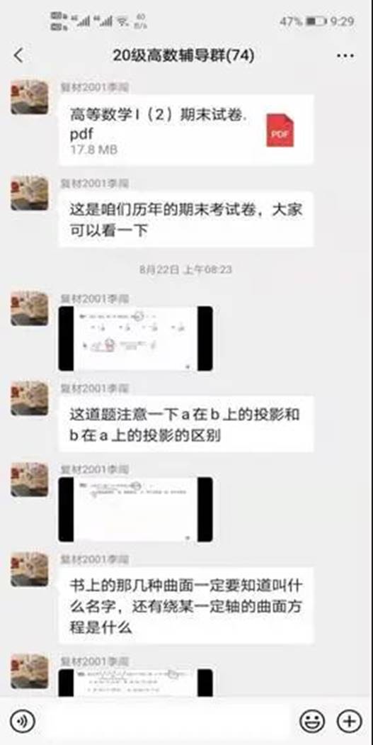 组建线上答疑群,讲师李闯和胥鑫负责答疑群中的帮扶工作中,二人利用微信群分享学霸笔记,在群里为大家解决自己的困难问题。