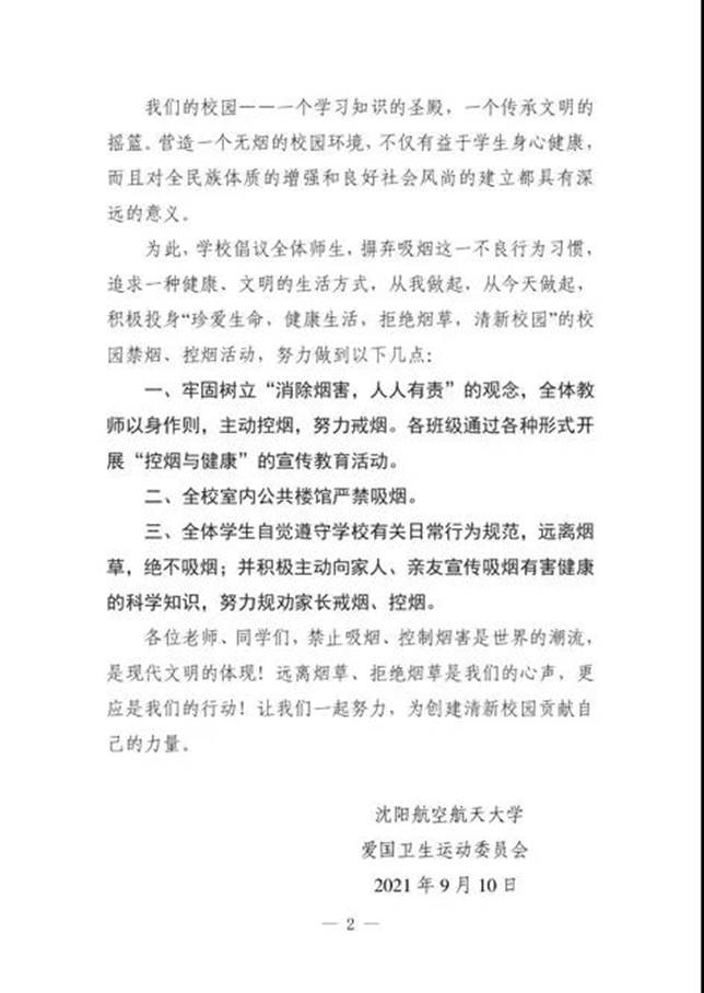 校园是学习知识的圣殿、传承文明的摇篮。共同营造一个绿色、洁净、文明的无烟校园环境,不仅有益于师生的身心健康,而且对全民族体质的增强和良好社会风尚的建立都具有深远的意义。为了提高校园文明水平,保障师生身体健康,树立和展现我院学生良好的精神面貌,我们应该坚决摒弃吸烟行为,创造文明、洁净、优美的校园环境。我们在此向全体大学生发出倡议:创建无烟校园,我们共同行动!