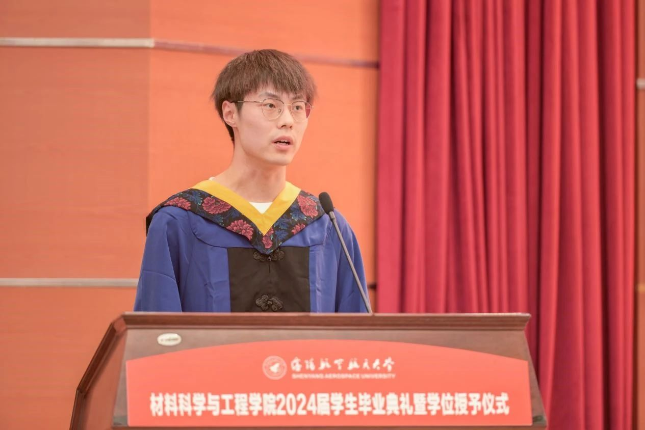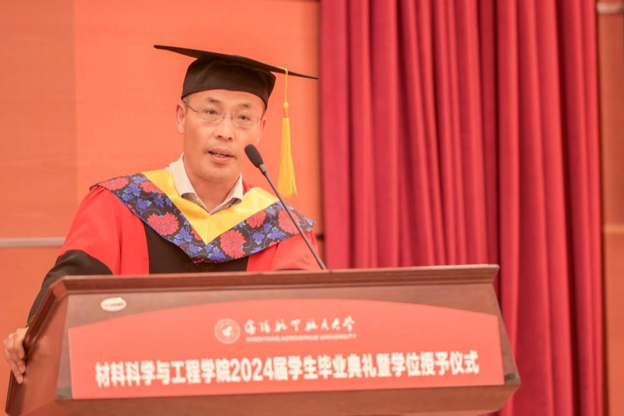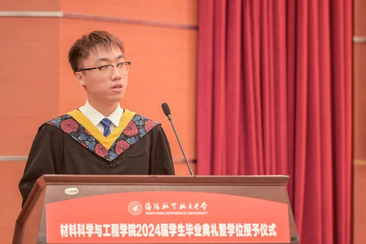 学院院长卢少微教授发表临别寄语。卢少微代表学院,向圆满完成学业的全体毕业生表示热烈祝贺,向悉心培养学生的老师们致以衷心的感谢,并从“材料传承”“材料过往”“材料水平”三个关键词分享了2024届毕业生与时代发展同频共振、与学院发展同向同行的美好岁月。这段美好的青春回忆将会永远刻在每个沈航人的心里。临别之际,卢少微勉励毕业生,一是要厚植家国情怀,践行青春向党的铮铮誓言;二是要自觉加强斗争历练,锻造时代需要的过硬本领;三是要紧握奋斗之桨,谱写不负韶华的青春之歌。在服务辽宁全面振兴新突破和航空航天事业发展中笃定钻研、精进有为,在中国式现代化的伟大实践中扛得起重任、经得住磨砺,贡献沈航智慧,做出材料担当!句句叮咛犹在耳畔,声声嘱托长存心间,院长的每句话语都是学生前进的动力。