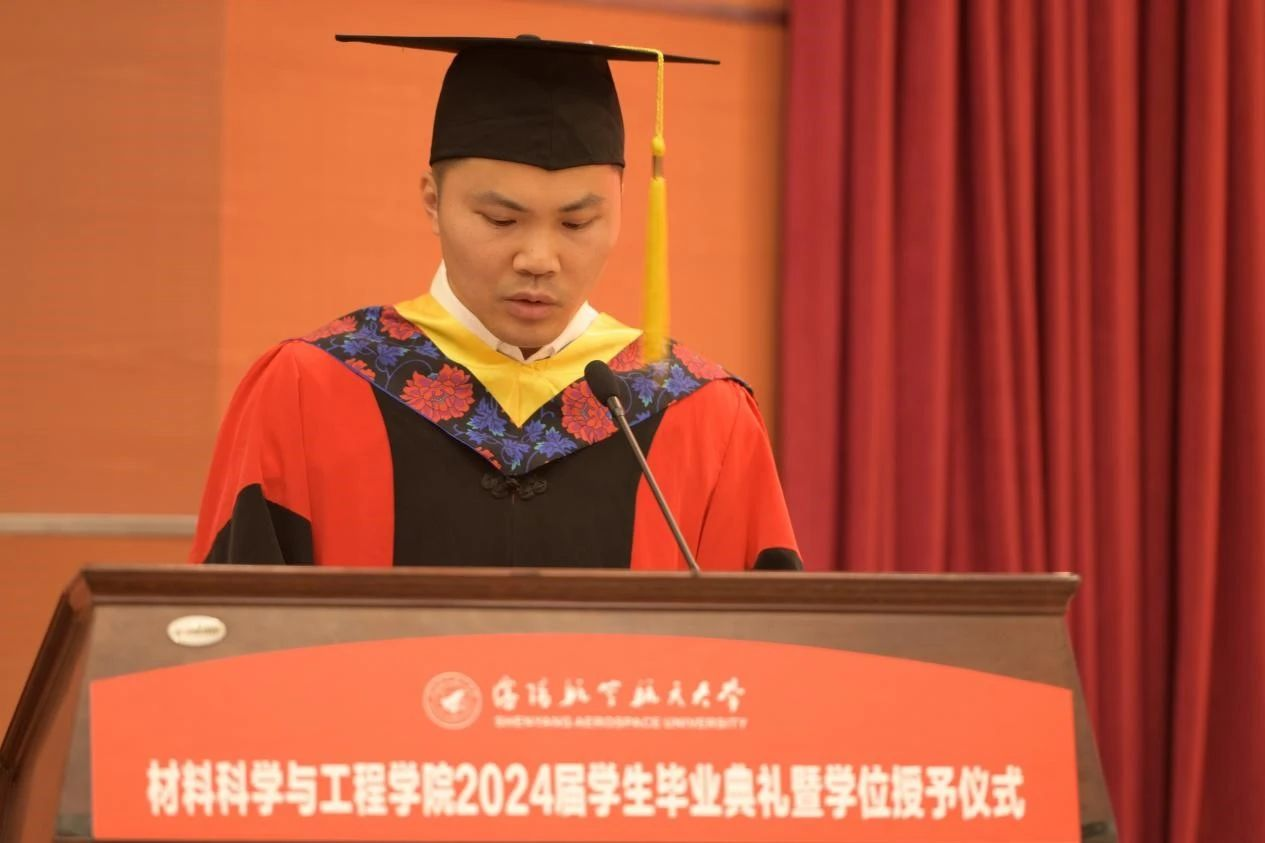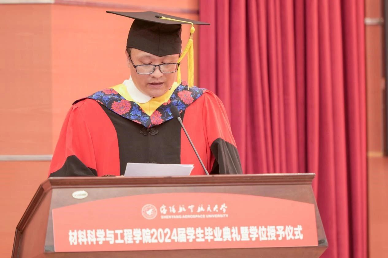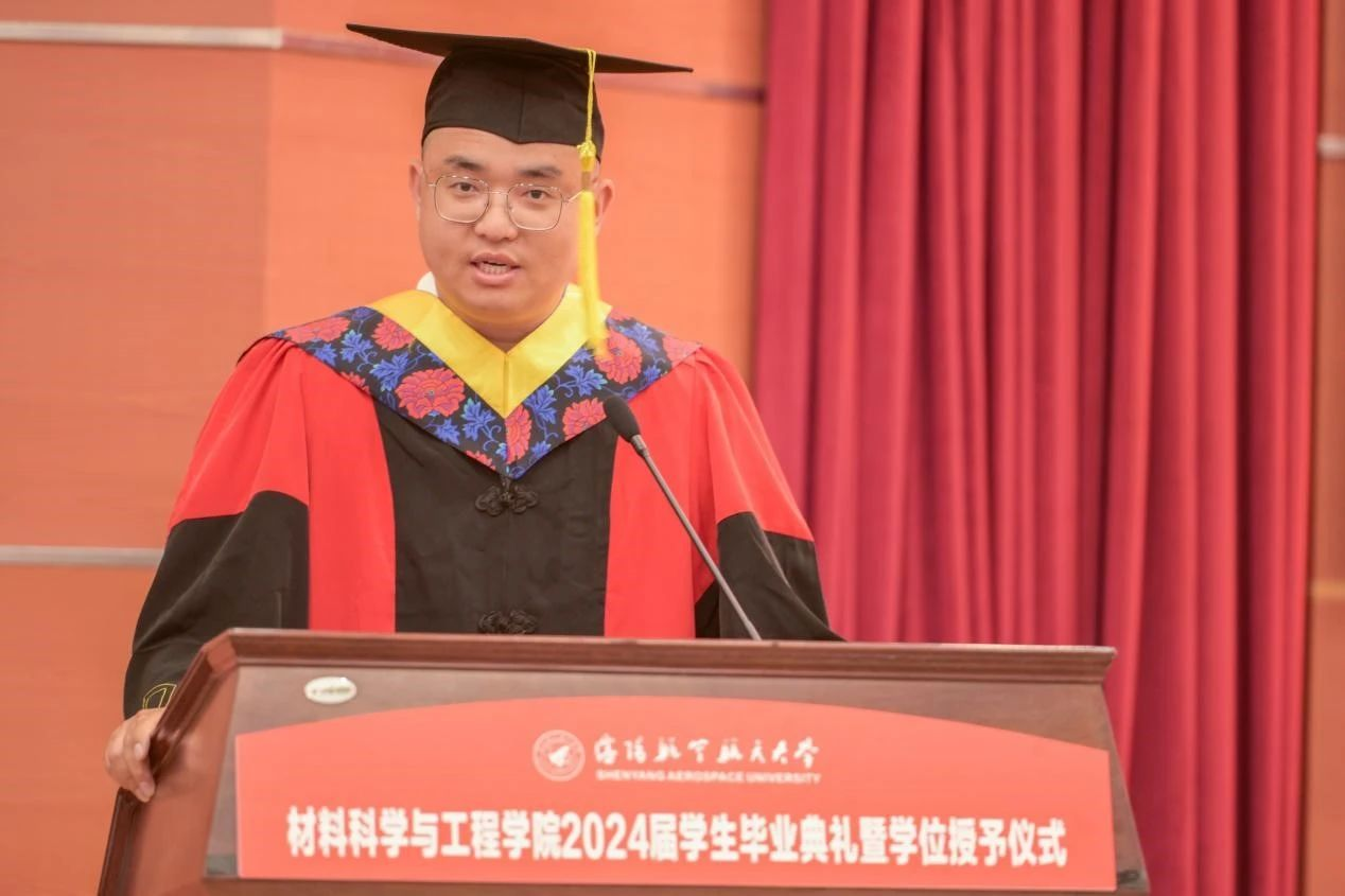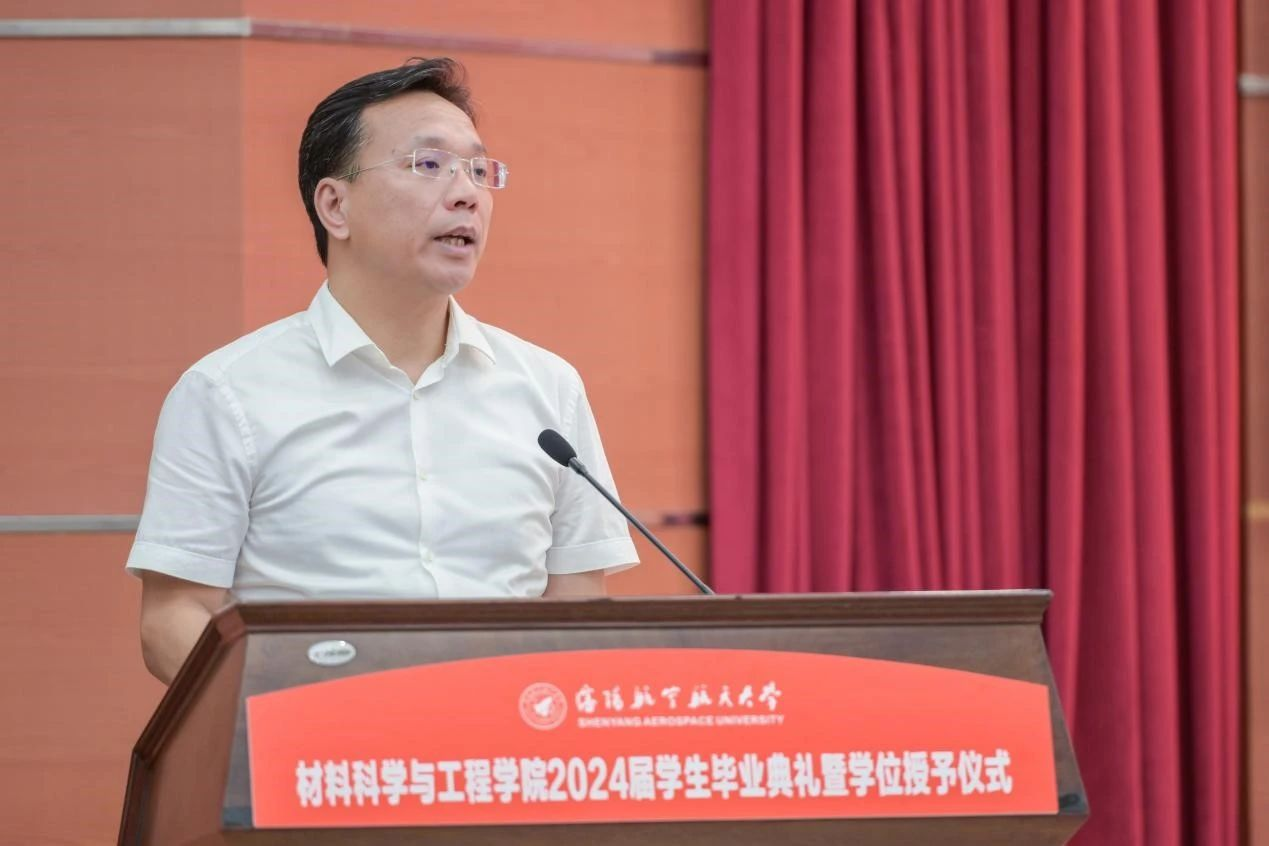 学院院长卢少微教授发表临别寄语。卢少微代表学院,向圆满完成学业的全体毕业生表示热烈祝贺,向悉心培养学生的老师们致以衷心的感谢,并从“材料传承”“材料过往”“材料水平”三个关键词分享了2024届毕业生与时代发展同频共振、与学院发展同向同行的美好岁月。这段美好的青春回忆将会永远刻在每个沈航人的心里。临别之际,卢少微勉励毕业生,一是要厚植家国情怀,践行青春向党的铮铮誓言;二是要自觉加强斗争历练,锻造时代需要的过硬本领;三是要紧握奋斗之桨,谱写不负韶华的青春之歌。在服务辽宁全面振兴新突破和航空航天事业发展中笃定钻研、精进有为,在中国式现代化的伟大实践中扛得起重任、经得住磨砺,贡献沈航智慧,做出材料担当!句句叮咛犹在耳畔,声声嘱托长存心间,院长的每句话语都是学生前进的动力。