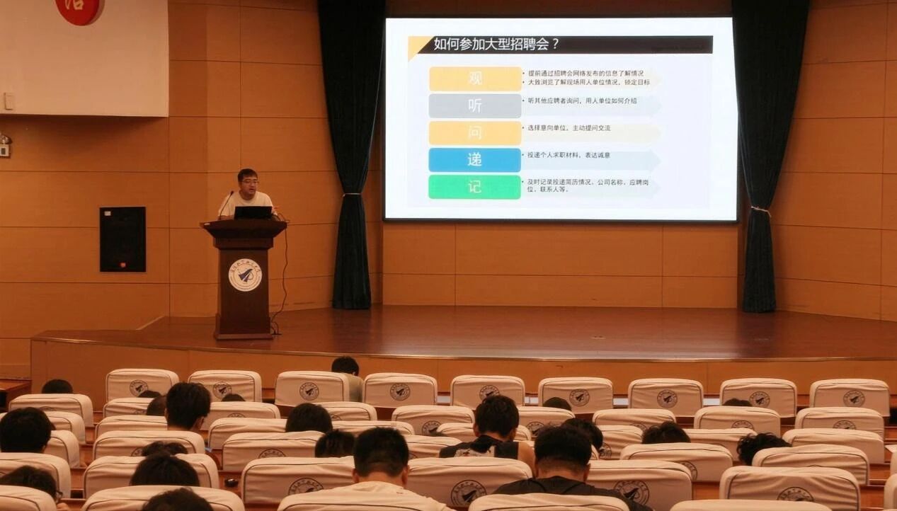 辅导员王金磊、郑志伟分别围绕本科生、研究生的择业特点展开详细讲解,在简历制作方面强调要突出专业技能和实践经历,针对不同岗位定制个性化简历;在面试技巧方面分享了常见面试问题的回答思路和应对方法,建议同学们保持自信、清晰表达观点。此外,还介绍了就业信息的获取渠道,提醒同学们关注学校就业指导中心、企业及各类招聘平台发布的信息,积极投递简历,争取每一个就业机会。