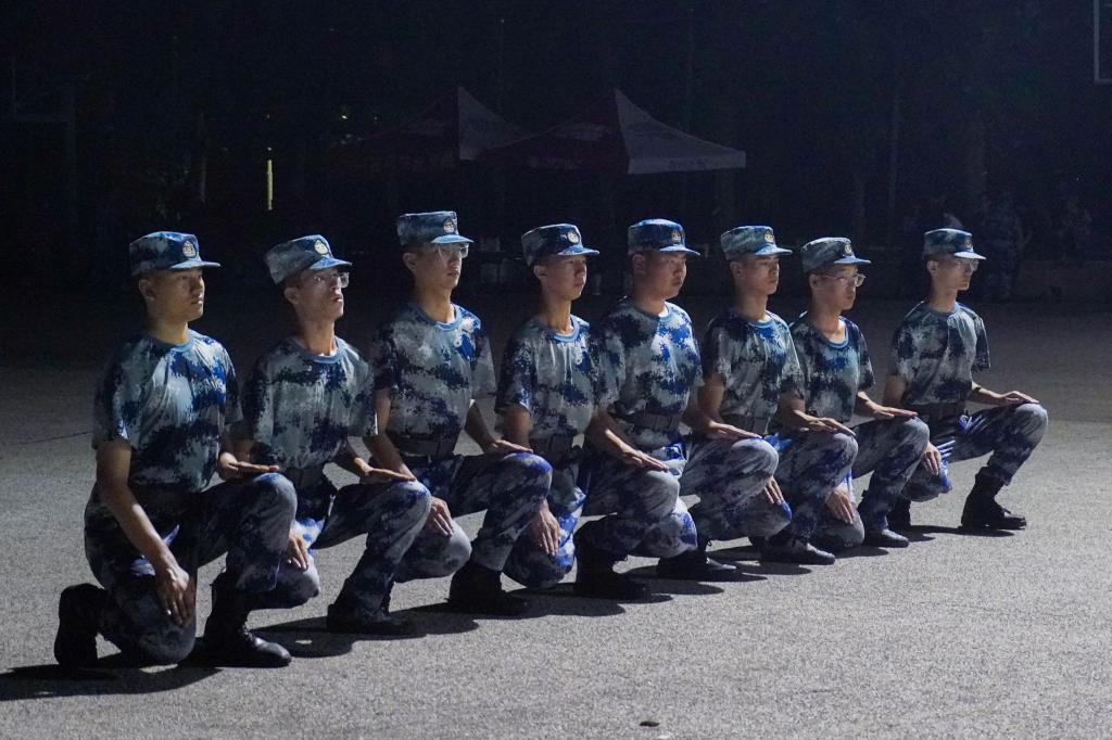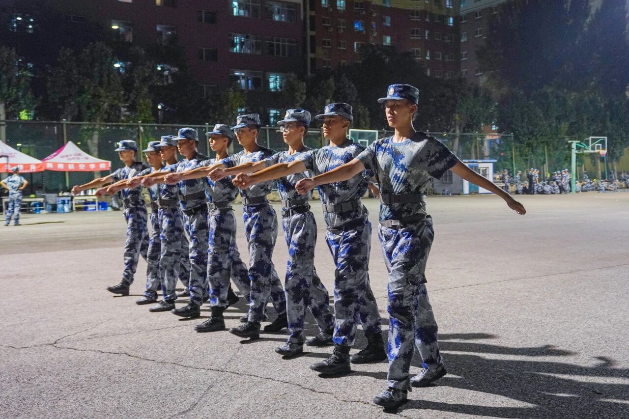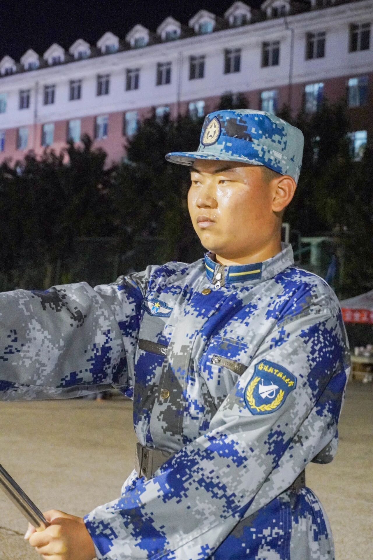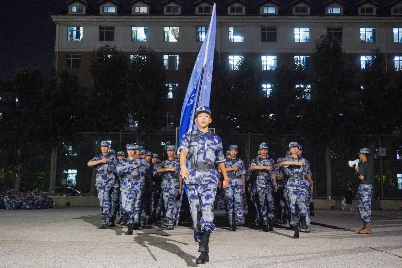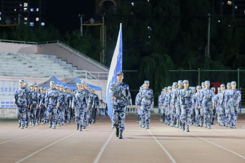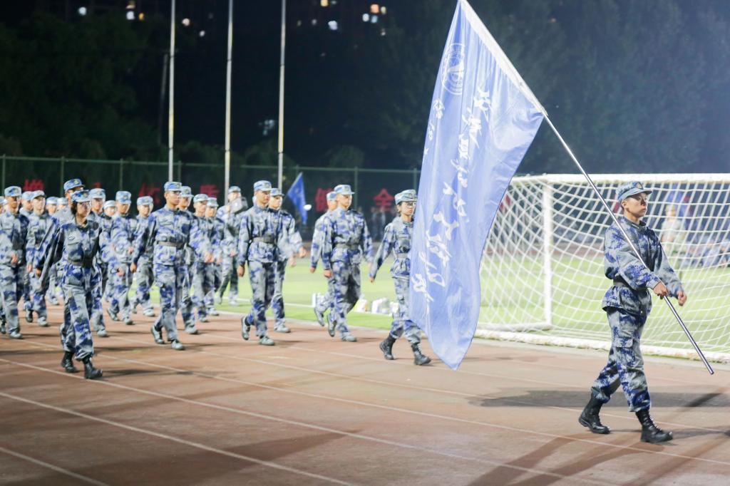 院旗在旗手手中高高扬起,在前方引领着方向,后方整齐的方队紧跟旗手,他们步伐统一,动作整齐,在夜色中前进,透露着坚定的力量。