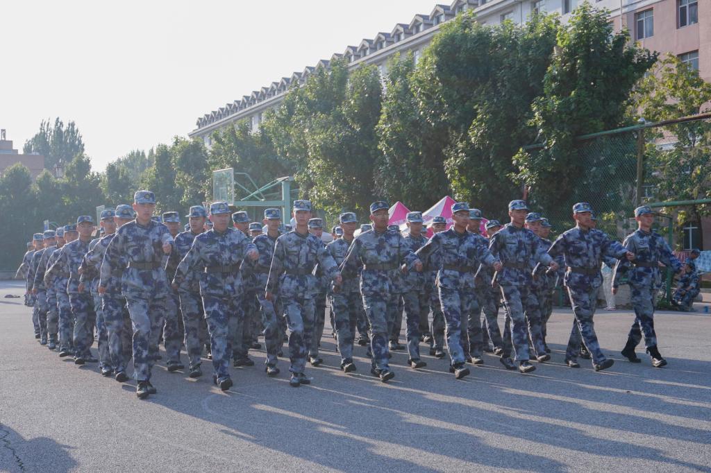 步伐一致,摆臂幅度标准,抬腿高度相同,动作整齐划一,透露着不服输的劲;手扶膝盖,身姿挺拔,长时间蹲姿,双腿早已酸痛,仍毫无动摇,意志坚定的保持着标准姿势。
