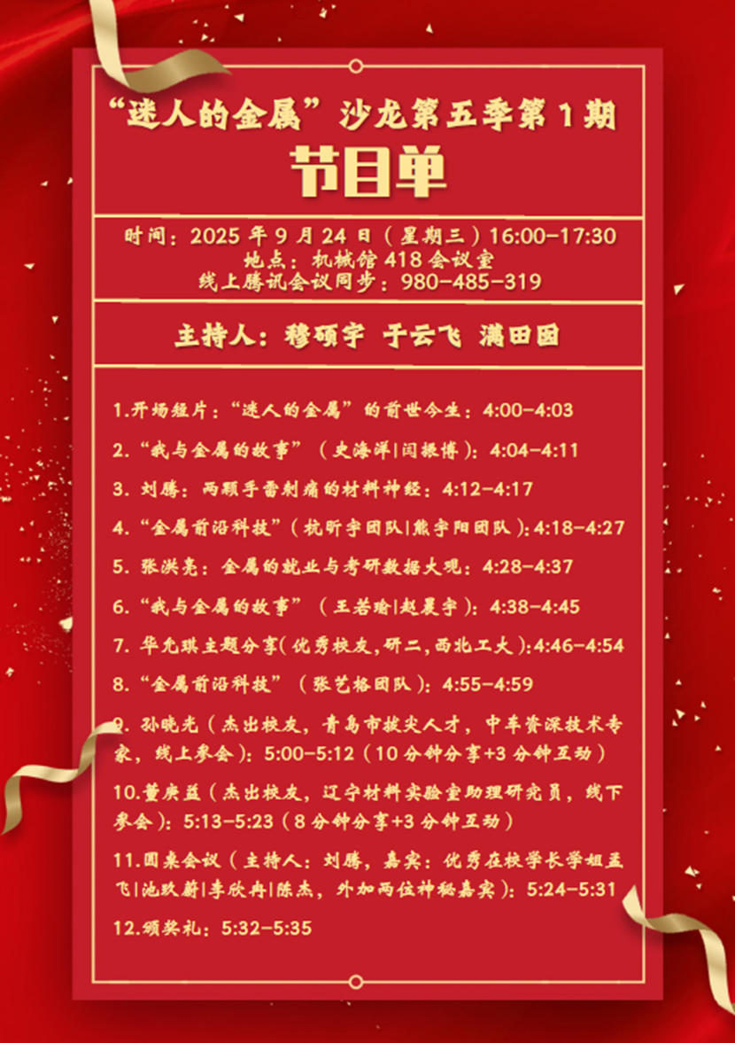 作为学院党委与教工第一党支部落实立德树人根本任务的重要载体,“迷人的金属”师生沙龙是支部探索“党建+育人”模式、以高质量党建引领发展的创新实践,亦是持续打造的特色品牌活动。自2021年创办以来,已走过五季共10期。活动始终以平等、自由、真诚的交流为内核,搭建起师生思想碰撞、经验传递的桥梁。五载深耕,沙龙收获了各级领导、嘉宾及师生志愿者的鼎力支持,赢得广泛赞誉,成为学院“三全育人”的生动注脚。